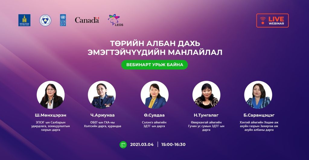 Либерал эмэгтэйчүүдийн Оюуны сангаас Занадын Засгийн газрын дэмжлэгээр НҮБХХ, Монгол Улсын Засгийн газар, Төрийн албаны зөвлөлтэй хамтран төрийн албанд ажиллаж буй эмэгтэйчүүдийн карьер төлөвлөлтөд нь туршлага, мэдлэг нэмэх зорилго бүхий “Төрийн албан дахь эмэгтэйчүүдийн манлайлал” сэдэвт вебинарыг 2021 оны 3 сарын 5 нд зохион байгуулсан юм.